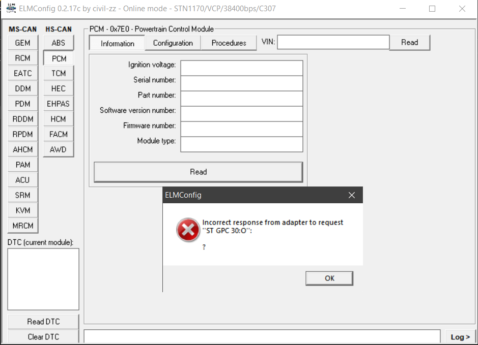 Zdravím! Dostal jsem se do úzkých, mám doma kabel vLinker FS USB, který mi s Forscanem jede hezky, ale pro aktivaci tempomatu potřebuju ELMconfig. Ten mi bohužel nejde rozjet, když ho otevřu po úvodním nastavení, hodí mi to chybu co je na obrázku.