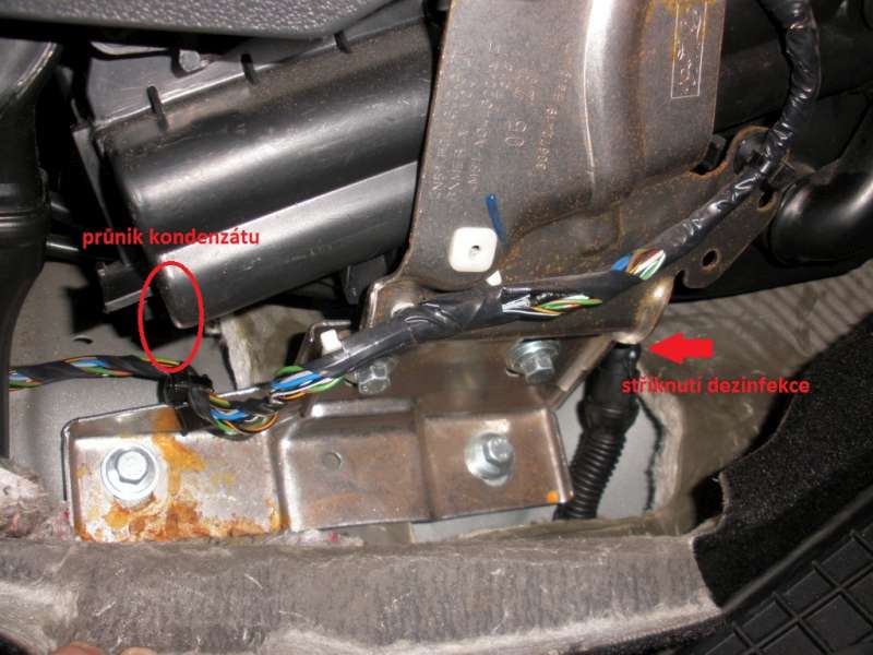 Předem se omlouvám jestli to tady dávám nevhod ale týká se to dezinfekce klimy. O víkendu jsem na to vletěl a provedl výměnu pylového filtru a dezinfekci klimy podle návodu ze strany 1. Jenže když jsem to začal stříkat do otvoru výparníku, začlo mi to protíkat na vyznačeném obrázku. Pouze to kapalo a důkazem toho, že tam dříve kapala i voda je i zrezlý plech. Nevíte co je to za problém?