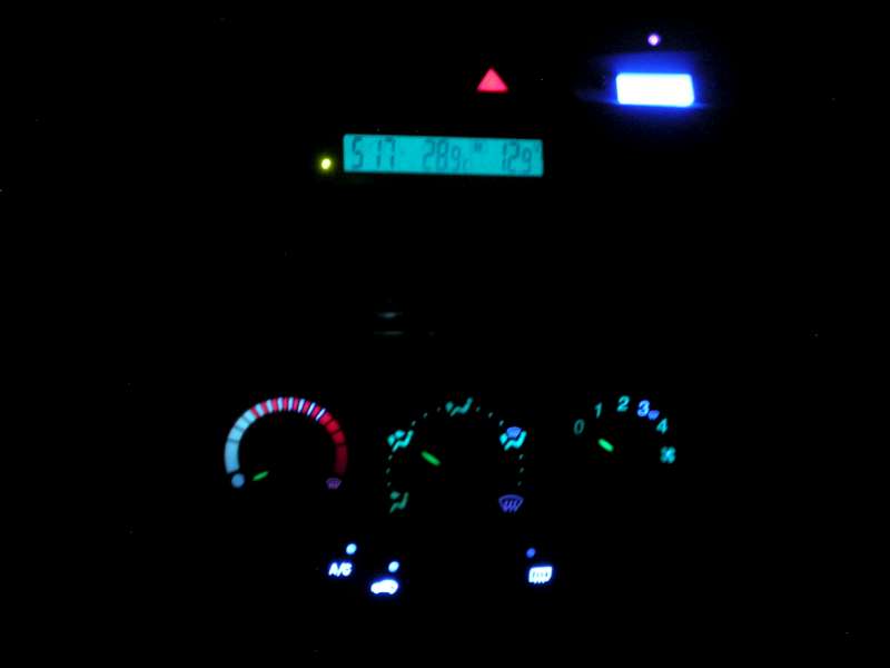 Tak konečne som sa pustil do poslednej zeleno svietiacej časti môjho interiéru - ovládačov ventilácie. Moje obavy sa naplnili, pôvodný plán bol vybrúsiť zelený plast ovládačov zvnútra a namiesto žiaroviek dať modré SMD diody. Problém je ale v tom, že zelená vrstva je skoro zvonku a spolu s ňou ide dole aj biela farba symbolov a hrozí aj prebrúsenie durch cez plast. Takže zostalo len pri výmene žiaroviek za diody, svieti to teraz tak zelenomodro, ale je to určite lepšie, ako zelené