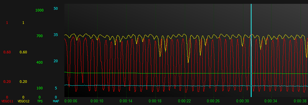 Jste si jisti, že ta diagnostika vzorkuje dostatečně často signál z lambdy a zachytí všechny cykly (tj.nedochází k aliasingu)? To by věděl autor Fordiag, jakou vzorkovací frekvenci diagnostika zvládne. Běžná levná OBD-II na to není příliš vhodná a ještě se zpomaluje čím víc je zapnuto PIDů (údajů, které se sledují).