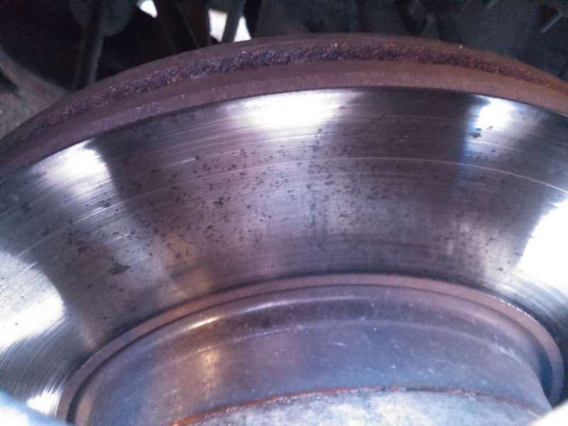 Stano myslí že to je od brždění a destičky "obtisklý", ale to vylučuju - schválně jsem to zkoušel, nikdy jsem nezůstal stát s přišláplou deskou. Za sucha nic, po dešti a delším stání (dva dny) se "obtisklá deska" objevila a to na všech kotoučích, přitom na zadních vylučuju i vysokou teplotu. V těch místech kde koroze začala to pak jede rychle, udělají se hrby a začne to kopat... Je dobrý nezajetý kotouče nenechat oreznout.