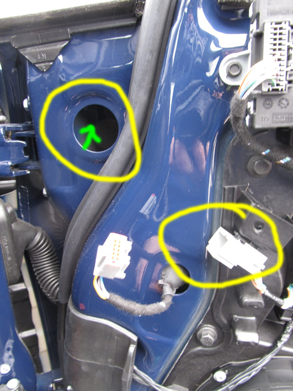 2. rozpojime konektor a zasuneme ho dovnitr dveri + vyndame gumovou zapadku (zlute oznaceno)