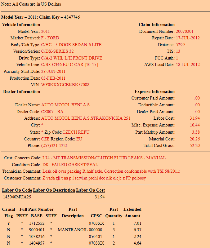 A zisti to i servis co byl provaden v Nemecku,kdyz auto pochazi odtud a ma pry i servisku?Treba u tohoto vinWF05XXGCD56T12556 je pocet zarucnich oprav 8,ma met najeto cca 120000km.Zatim jsem to nezaplatil,tak nevim co bylo opraveno