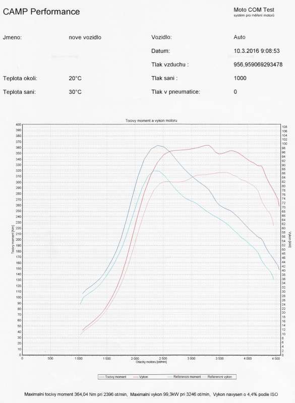 Ahoj, první momenty po optimalizaci na třetí nebo čtvrtý rychlostní stupeň byl pocit ze zátahu od nějakých 1900 ot. hodně znát. Postupem času jsem si ale na zvýšený výkon zvykl a už mi to ani nepřijde. Před navýšením naměřeno na brzdě 86kW a 329nm. Hodnoty výkonu zvednuty na 100kW a 360nm. Víc mi to nechtěl zvyšovat z důvodu vyššího kilometrového proběhu. Motor nekouří a emise na STK dopadla taky ok. Dovolená hodnota kouřivosti je 1,82, naměřená 1,6. Rozpětí hodnot kořivosti čtyř po sobě jdoucích zkoušek dovolená 0,25, naměřená 0,21. EGR ventil ponechán zaslepený.