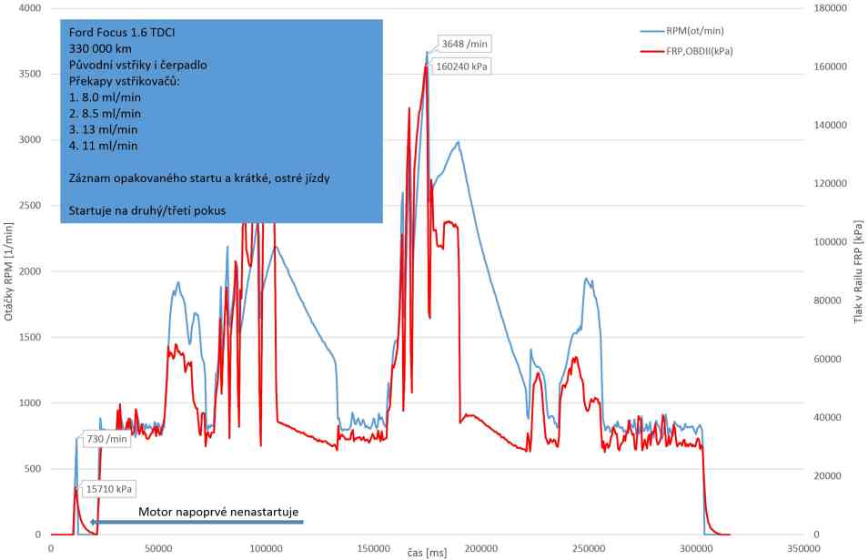 Když jsem se ještě podrobně podíval na první start, tak tlak v railu stoupal 1.3 s. Nevím, jestli to není moc pomalu a jestli to neukazuje na nějaký problém. U opakovaného startu už tlak dosáhl za ten čas vyšší hodnoty (22 MPa) a motor chytil.
