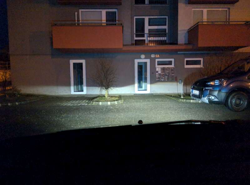 Tu je vidieť, že moje halogénové svetlá jednak nie sú asi úplne dobre nastavené a jednak aj silu F2 žiaroviek, ktoré kompletne presvietili obyčajné žiarovky.