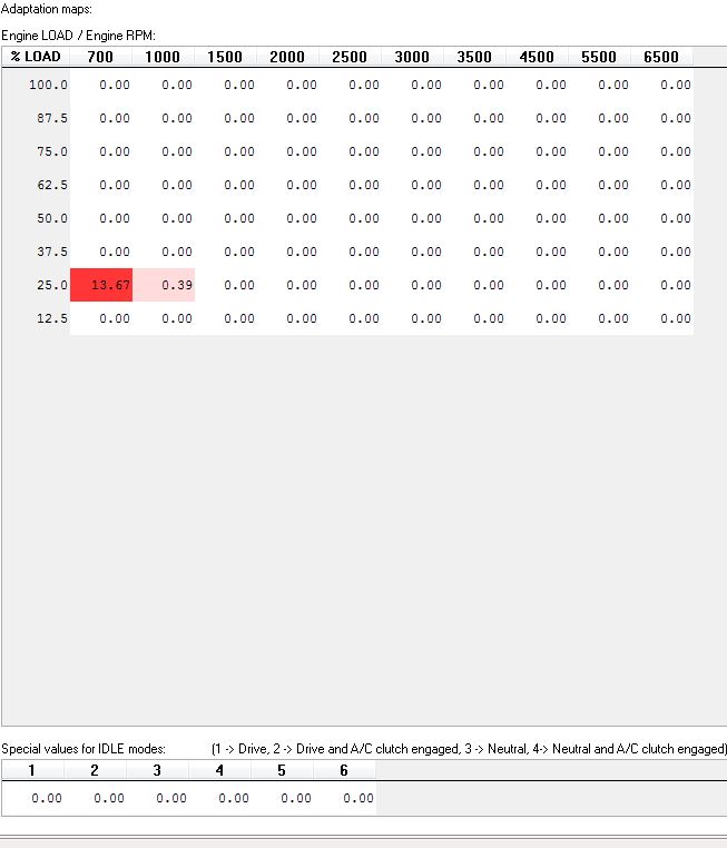 Po resetu ŘJ a pár minutách na volnoběh červené adaptace v oblasti 700ot/25%load. Pokud jsem nešahal na plynový pedál, neměly by se adaptace tvořít spíše ve spodním řádku - hodnoty pro volnoběh? (Screen dole.)