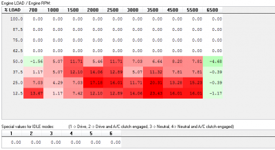 Používám Fordiag a nějakou tabulku už jsem v životě viděl. Tomin k tomu asi řekne víc, ale já bych to zatím neřešil. Do odchylky 10% to nemá smysl. Zajímavé je, že ty "nejhorší" buňky jsou vesměs osamocené, ty sousední jsou naprosto v pořádku. Podle mě to může být jen chybný přepočet.