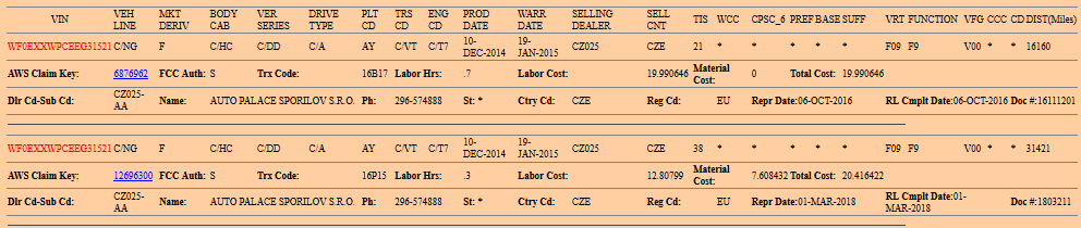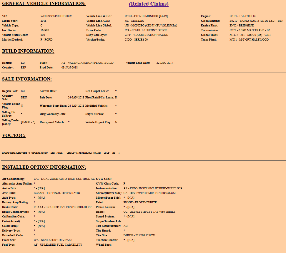 Mám jednu prosbu. Minulý týden jsme do rodiny koupili Mondeo MkV. VIN je WF0FXXWPCFHE38859. Bohužel Fordzona stále nefunguje, pro CatCar a 7zap je VIN příliš mladý a nemají ho v databázi. Auto bylo vyrobené 2/1018, pochází ze SRN a bylo koupené v autobazaru AutoRE v Bylanech.