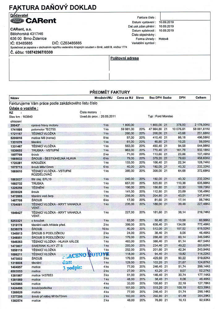 Zbylých 30% doplatil Ford. Pro zajímavost přikládám fakturu.