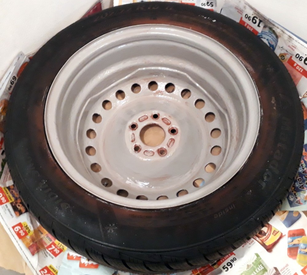 - výchozí stav disků byl mnohem lepší, než v případě těch zimáků, co jsem stříkal na stříbrno, takže i výsledek je mnohem lepší (nebylo potřeba vyrovnávat velkou drsnost způsobenou masivní korozí)