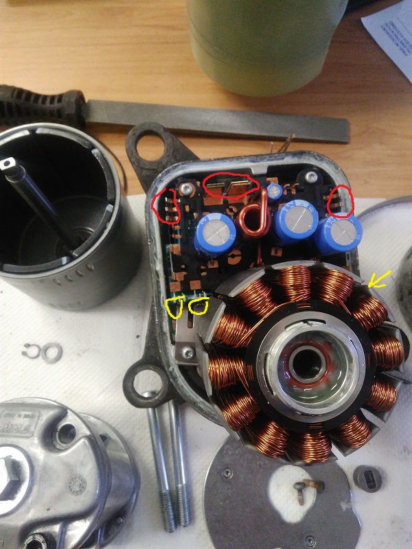 Pokud by jste chtěli sundat i stator a dostat se k samotné desce je třeba povolit 4 šrouby viz červené kolečka a šipka rozdělat ty spoje těch konektorů a ještě je na statoru plechová pojistka. Tady ukázka jak vypadá ta pojistka sundaná a je zde vidět i druhé ložisko. Na závadu v mém servu jsem zatím nepřišel.
