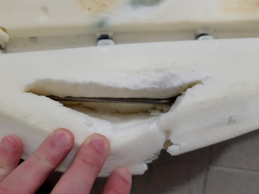 Nyní je potřeba odlepit dečku výhřevu. Ta, na rozdíl od jiných model, u kterých jsem měl tu čest měnit nebo dodělávat výhřev, drží opravdu dobře. Dečka je trošku jiná, není tam mřížka jemných drátů, ale poměrně tlustý drát. Nemusíte se bát, že byste jej přetrhli - přesto ale opatrně. Mě to šlo dolů jen za cenu toho, že se to slouplo i částí molitanu, kterou jsem pak musel pracně oddělat. Asi největší zdržovačka z celé montáže.
