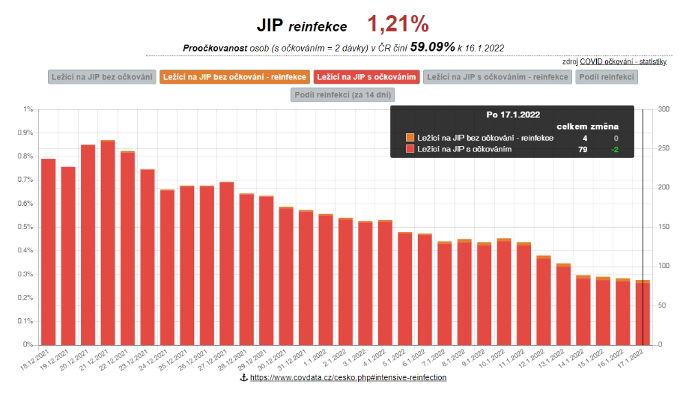 Takže vezmeme jeden den 17.1.2022 a budeme 210/517 hospitalizovaných a 40/79 JIP první číslo je zdesetinásobené číslo reinfikovaných.