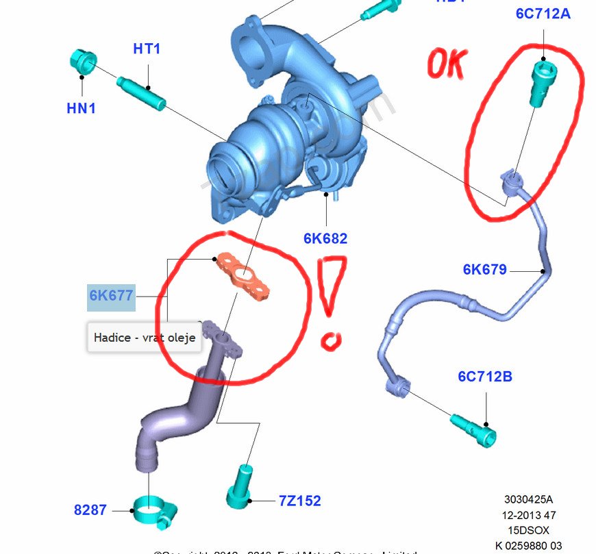 Konečně jsem se k tomu dostal. Vratná trubka oleje k turbu je suchá. Může to prolínat jen v sání, tam kde je cosi jako silikonové těsnění mezi 6A664A a turbem. https://ford.7zap.com/cs/car/183/code.f ... 362#6A664A