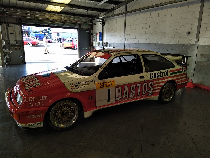 Už jsem v depu! Pro mě totální překvapení a vůbec vrcho celého Ford Fairu. Než jsem tam jel, tak jsem doufal, že někdy uvidím na živo Sierry RS500 Cosworth , ale nečekal jsem že uvidím mojí srdcovku v barvách Kaliber, kterou stavěl a pilotoval sám Andy Rouse, asi vůbec nejslavnější závodník BTCC. kousek od ní pro změnu Sierra RS500 Cosworth od Eggenberger jako jediná ( ikdyž původně samozřejmě černá ) ve světlých barvách Bastos, která vyhrála 24hodinovku na okruhu ve SPA, se kterou jezdil Gianfranco Brancatelli. Jedna z mála levostrancýh RS500. Za okny obou závodních legend papírky s pořadovým písmenem a číslem - takže budou jezdit na trati! K tomu ale později. Pro mě opravdu splnění snu. Stojím u Andyho Sierry a je zvláštní jí pozorovat. Byl to vůz ze sezóny 1989, který sice nebyl tak úspěšný jako ten v sezóně 1988, ale ne o moc. Na první pohled je poměrně dlouhá, až Vás zaskočí jak je úzká a nízká. Závodní verze už měla 17" kola na 3dílných křemíkových BBS ráfcích a pochopitelně na slickách. Byl jsem jako u vytržení, když mi majitel po otázce, jestli mohu nakouknout dovnitř spojeně řekl "Yes, of course" a mohl to vidět i zevnitř. To nejlepší na závěr - stojím přímo před motorem a jen žasnu. Dvoulitrový motor, dvě vačky, 4 válec a turbo T04 natlačené k 2,5 baru a výkon 560koní....Je prostě šílené, že s tím v dobách slávy dokázali jet 189 mph/h ... Okolo tohoto auta jsem stepoval nejvíc a něchtělo se mi od něj vůbec odcházet. Paradoxně, nakonec jsme se k němu vrátili ještě jednou, prostě u mě, to ani jinak nešlo:) Dalo by se v tu chvíli říct, že kdyby jsme po tomhle setkání museli už odjet, já bych odjížděl spokojený a klidný se spokojeným úsměvem!