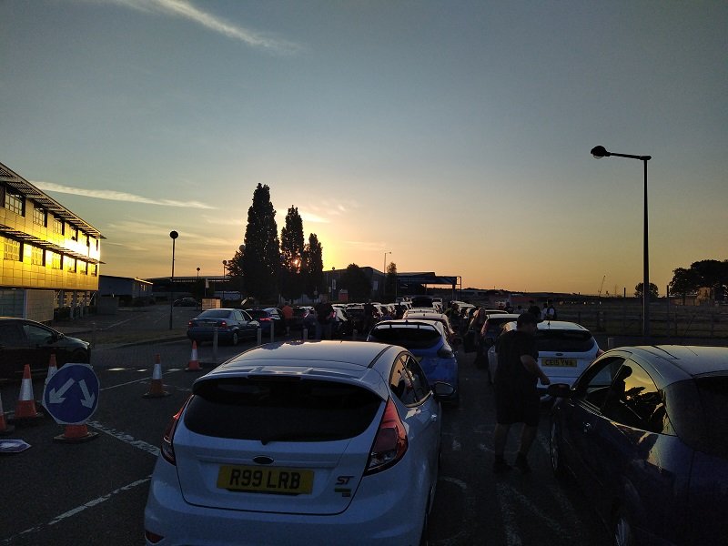 Vjíždíme dovnitř - ono se to fakt stalo! Jsme tady! Na zrcátku nám visí označení, kde budeme mít vystavené auto uvnitr mezi ostatními. Nedá se, než prostě uznat a smeknout, jak perfektně to bylo zorganizováno uvnitř. Hned si nás rozřadili, kam máme jet, takže během asi 3minut, jsme byli na svých místech. Prostě palec nahoru. Vzhledem k tomu, že jsme byli uvnitř, vůbec mezi úplně prvními, měli jsme výhodu, žádná fronta na jídlo, žádná fronta na wc. Takže jsme se uvelebili ke snídani, kdy mezitím, co jsme jedli jsme viděli na hlavní tepnu která vede na most přes část trati - takže všechno co příjíždělo dovnitř, nám jelo přímo před očima. Člověk by neměl přehánět a měl by vždy stát nějak soudně nohama na zemi, ale těžko se to popisuje, když to nevidíte každý den, respektive, když to nevidíte nikdy. Takže mezitím, co jsme jedli, kolem nás jezdily Fiesty a Escorty od prvních generací ve stavu těžko věřícím. Za ním přijíždí první Sierry...občas proletí Focus RS MK1, za kterým od nikud přiletí Escort RS Cosworth...po chvilce klidu a uklidnění všech turbodmychadel - projíždí Cortiny, Granady, Mondea....zkrátka slušný rozjezd.