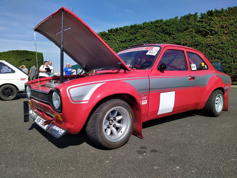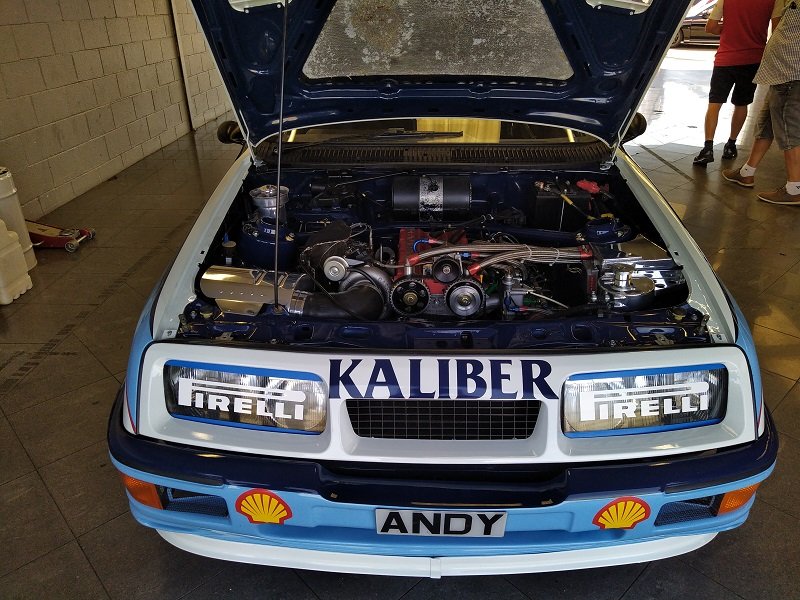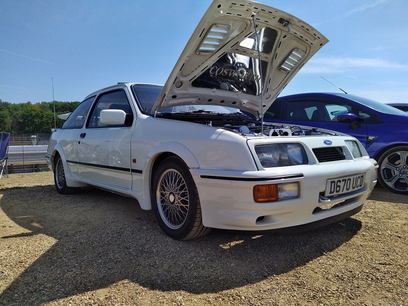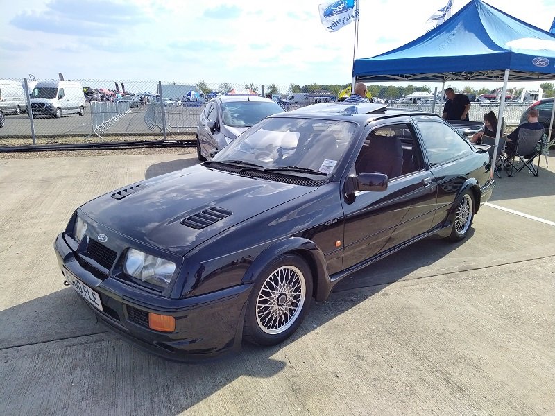 Jízdy pokračovaly během celého dne, takže jsme šli dál po okruhu sledovat, co vše ještě můžeme vidět. Za zmínku stojí určitě stánek hlavního sponzora Mountune. Stály se tam velké fronty v turniketech na prodej dílů - a že to tam chvíli vypadalo, jako kdyby ty věci dávali zadarmo. Za menším hloučkem lidí - závodní verze Ford RS200. Jdeme dále - nacházíme místo se stánky s občerstvením a autokosmetikou. Před ním stojí stará hranatá Fiesta - s motorem YB Cosworth a Turbem T04, přestavěnou na zadní náhon. Majitel patrně šílenec. Asi po další půlhodině procházení mezi zajímavými kousky, které byly různě zatoulané - jako třeba pár Focusů RS MK1, které nestály u hlavního dvojřadu. Co jsme tak pochopili, tak jsou určité zóny, kde jsou určitá auta pospolu a pak ještě zóny, kde jsou kluby. Takže proto se kolikrát objevily auta různě rozházená. Ale bylo to svým způsobem takové pestřejší a vlastně dopředu nikdo nevěděl, co tam bude stát. Po chvíli vidím první Sierru RS Cosworth v bílé barvě a 3dveř s ploutví. Není to RS500, ale první civilní třídveř. Vedle něj Saphire RS Cosworth. Oba kousky přepečlivě umyty a naleštěny. Kousek od těchto krásných kousků procházíme místem, kde byla burza s díly, stánky s různým oblečením, nálepkami, kosmetikou, díly, modely autíček až po občerstvení. Na chvíli odběhnul Mates - ikdyž tam nebylo tak přelidněno jak jsem čekal, během pár vteřin byl pryč. Za chvíli se objevil, drapnul mě a že se asi poseru! - No skoro ano, Ford Capri, ale překopaný dobovým týmem DRM (předchůdci DTM) Zakspeed. Takže na place stál Ford Capri Zakspeed Turbo. Upřímně bych tohle čekal spíše mimo Anglii, ale tohle mě dostalo! Byly dvě varianty motorů - 1,4 Turbo 480koní 9200 ot/min a 1,7 Turbo něco přes 600koní a stejně točící se nesmysl...Přiznám se, že nevím která jednotka v tom byla, ale bylo to šílené, vidět to na vlastní oči a z blízka. Auto z trubek o váze kolem 800kg s takovým výkonem. Masivní bodykit a pod dlouhou kapotou malý brutální mixér, který ve své době neměl konkurenci. Takže zase zpět nohama na zem a jde se dál. O kousek dál nám zase předvedli angličani zlaté ruce a lidovou tvořivost. Focus RS MK2 Cabriolet... To už se po sobě díváme, jestli nemáme úpal, ale tam to asi krom nás 4 nikoho ze židle nezvedalo. Pomalu jsme dostávali hlad, takže jsme se odebrali směrem ke stánku. Po cestě nacházím první Sierru RS500 Cosworth v originál verzi, ale místo T04 bylo turbo Borg Warner. Přicházíme ke stánkům na anglický cheesburger, který byl snad asi nejlepší, jaký jsem kdy jedl, až na uřvanou prodávající, která byla jako papoušek a v okruhu stánků jsme slyšeli jen ji a její " Next please! " . Nicméně sedímena u stolu a díváme se na Mustang Shelby GT500 Eleanor...Po jídle jsme pokračovali v procházce dále. Na jednom place bylo asi 20kousků Fiesty ST200 v šedé barvě. Po cestě vidíme palouk, kde z dálky září oranžová asi 80ks ST Focusů MK2 a MK3, nacházíme Escorty, Mondea, Escorty ve verzi kurýr, Sierru pickup. Mondea ST220....bylo toho tolik, že se to nedalo ani všechno zapamatovat a fotit.