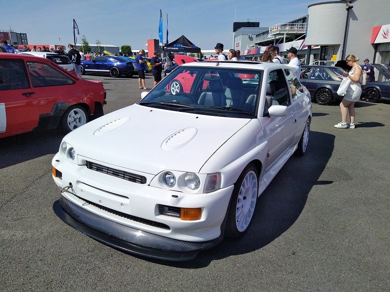 Jízdy pokračovaly během celého dne, takže jsme šli dál po okruhu sledovat, co vše ještě můžeme vidět. Za zmínku stojí určitě stánek hlavního sponzora Mountune. Stály se tam velké fronty v turniketech na prodej dílů - a že to tam chvíli vypadalo, jako kdyby ty věci dávali zadarmo. Za menším hloučkem lidí - závodní verze Ford RS200. Jdeme dále - nacházíme místo se stánky s občerstvením a autokosmetikou. Před ním stojí stará hranatá Fiesta - s motorem YB Cosworth a Turbem T04, přestavěnou na zadní náhon. Majitel patrně šílenec. Asi po další půlhodině procházení mezi zajímavými kousky, které byly různě zatoulané - jako třeba pár Focusů RS MK1, které nestály u hlavního dvojřadu. Co jsme tak pochopili, tak jsou určité zóny, kde jsou určitá auta pospolu a pak ještě zóny, kde jsou kluby. Takže proto se kolikrát objevily auta různě rozházená. Ale bylo to svým způsobem takové pestřejší a vlastně dopředu nikdo nevěděl, co tam bude stát. Po chvíli vidím první Sierru RS Cosworth v bílé barvě a 3dveř s ploutví. Není to RS500, ale první civilní třídveř. Vedle něj Saphire RS Cosworth. Oba kousky přepečlivě umyty a naleštěny. Kousek od těchto krásných kousků procházíme místem, kde byla burza s díly, stánky s různým oblečením, nálepkami, kosmetikou, díly, modely autíček až po občerstvení. Na chvíli odběhnul Mates - ikdyž tam nebylo tak přelidněno jak jsem čekal, během pár vteřin byl pryč. Za chvíli se objevil, drapnul mě a že se asi poseru! - No skoro ano, Ford Capri, ale překopaný dobovým týmem DRM (předchůdci DTM) Zakspeed. Takže na place stál Ford Capri Zakspeed Turbo. Upřímně bych tohle čekal spíše mimo Anglii, ale tohle mě dostalo! Byly dvě varianty motorů - 1,4 Turbo 480koní 9200 ot/min a 1,7 Turbo něco přes 600koní a stejně točící se nesmysl...Přiznám se, že nevím která jednotka v tom byla, ale bylo to šílené, vidět to na vlastní oči a z blízka. Auto z trubek o váze kolem 800kg s takovým výkonem. Masivní bodykit a pod dlouhou kapotou malý brutální mixér, který ve své době neměl konkurenci. Takže zase zpět nohama na zem a jde se dál. O kousek dál nám zase předvedli angličani zlaté ruce a lidovou tvořivost. Focus RS MK2 Cabriolet... To už se po sobě díváme, jestli nemáme úpal, ale tam to asi krom nás 4 nikoho ze židle nezvedalo. Pomalu jsme dostávali hlad, takže jsme se odebrali směrem ke stánku. Po cestě nacházím první Sierru RS500 Cosworth v originál verzi, ale místo T04 bylo turbo Borg Warner. Přicházíme ke stánkům na anglický cheesburger, který byl snad asi nejlepší, jaký jsem kdy jedl, až na uřvanou prodávající, která byla jako papoušek a v okruhu stánků jsme slyšeli jen ji a její " Next please! " . Nicméně sedímena u stolu a díváme se na Mustang Shelby GT500 Eleanor...Po jídle jsme pokračovali v procházce dále. Na jednom place bylo asi 20kousků Fiesty ST200 v šedé barvě. Po cestě vidíme palouk, kde z dálky září oranžová asi 80ks ST Focusů MK2 a MK3, nacházíme Escorty, Mondea, Escorty ve verzi kurýr, Sierru pickup. Mondea ST220....bylo toho tolik, že se to nedalo ani všechno zapamatovat a fotit.