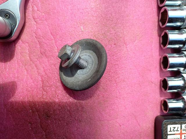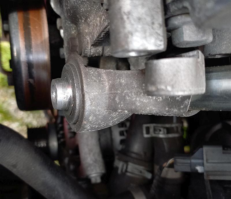 Řemen klimatizace byl podstatně horší, jelikož přípravek na to nemám, ale taky jsem to nakonec přepral. Co mě překvapilo, je uložení řemenice kladky, kterou jsem také měnil. Čep, na kterém je nasazena, sahá pouze cca do poloviny šířky ložiska, pak je to stáhnuté už šroubem. Zvláštní, tohle jsem zatím nikdy ještě neviděl: