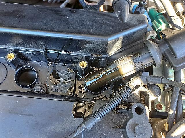 U prvního válce to nebylo až tak dramatické, no ale u čtvrtého jsem se doslova zhrozil. Guma od cívky doslova ležela v oleji, vysušil jsem vnitřek hadrem a když jsem vymontoval svíčku, tak to bylo jako bych jí zrovna vytáhl z oleje, normálně to z ní kapalo.