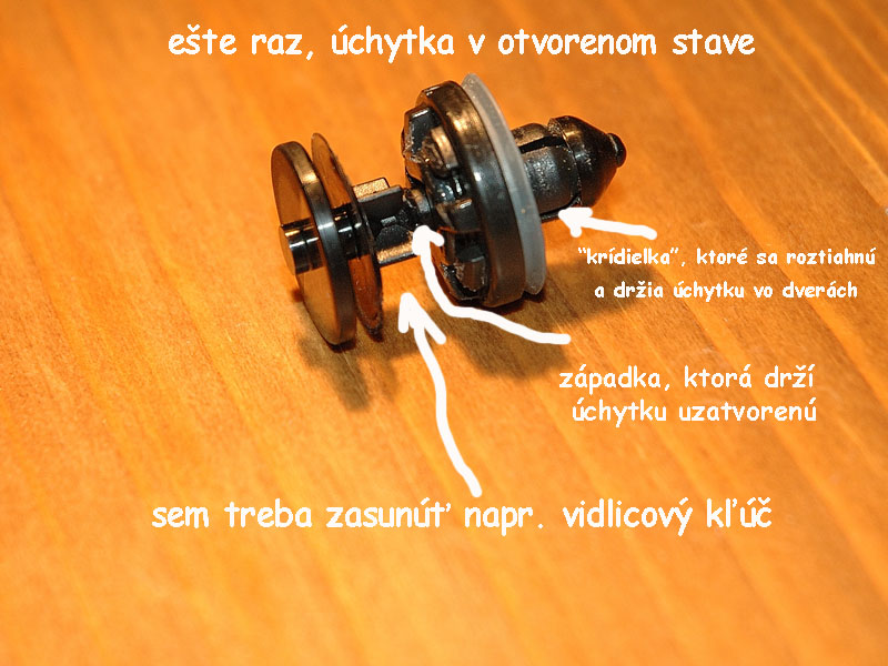Pomocou napr. vidlicoveho kluca (ja som si este pomohol aj srobovakom, aby to malo tri oporne body-ide to lahsie), treba ho strcit medzi vysuvaciu cast uchytky a pevnu, ktora je na plechu dveri, a tym vlastne uchytku otvorite, "kridielka" sa stiahnu a bude sa dat s plechu dveri vybrat. Nasadite na tapacirung (v otvorenom stave,