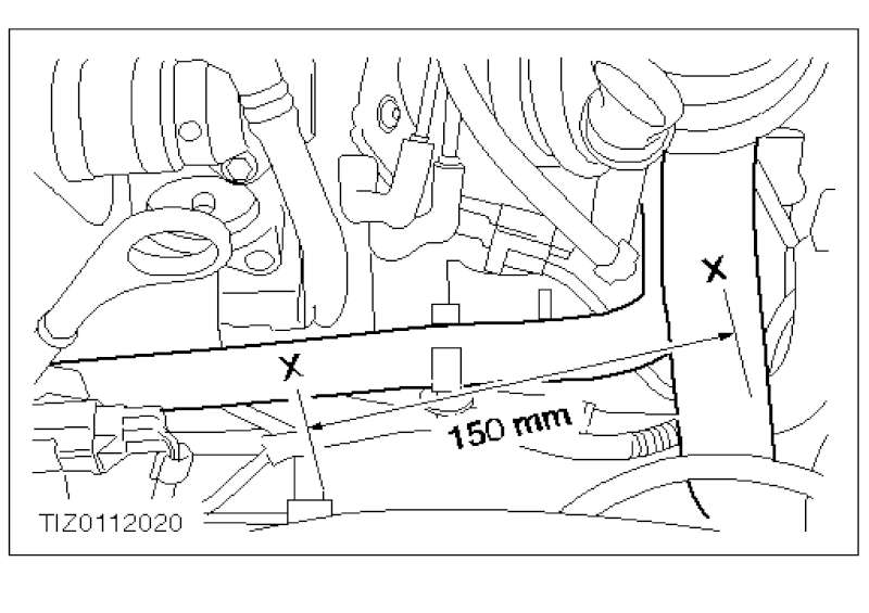 µ 10. Anhand des Bypass-Kits (siehe "Notwendige Ersatzteile") oberen Kühlerschlauch und Rücklaufschlauch - Heizung, wie gezeigt, markieren.