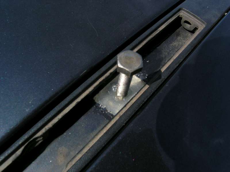 V zimě jsem narychlo vydlabal díry do tmelu a po zimě jsem je zašrouboval 10mm dlouhýma šroubama M6 se zápustnou hlavou. Minulý týden ve středu jsem je zkusil vyšroubovat, a 2 byly chycené rzí. Rozhodl jsem se udělat následující. Zvětšil jsem díru do tvaru pravidelného obdelníka viz. foto. Nešlo ani tak o zvětšení, ale dělal jsem to hlavně proto, abych odstranil špínu,