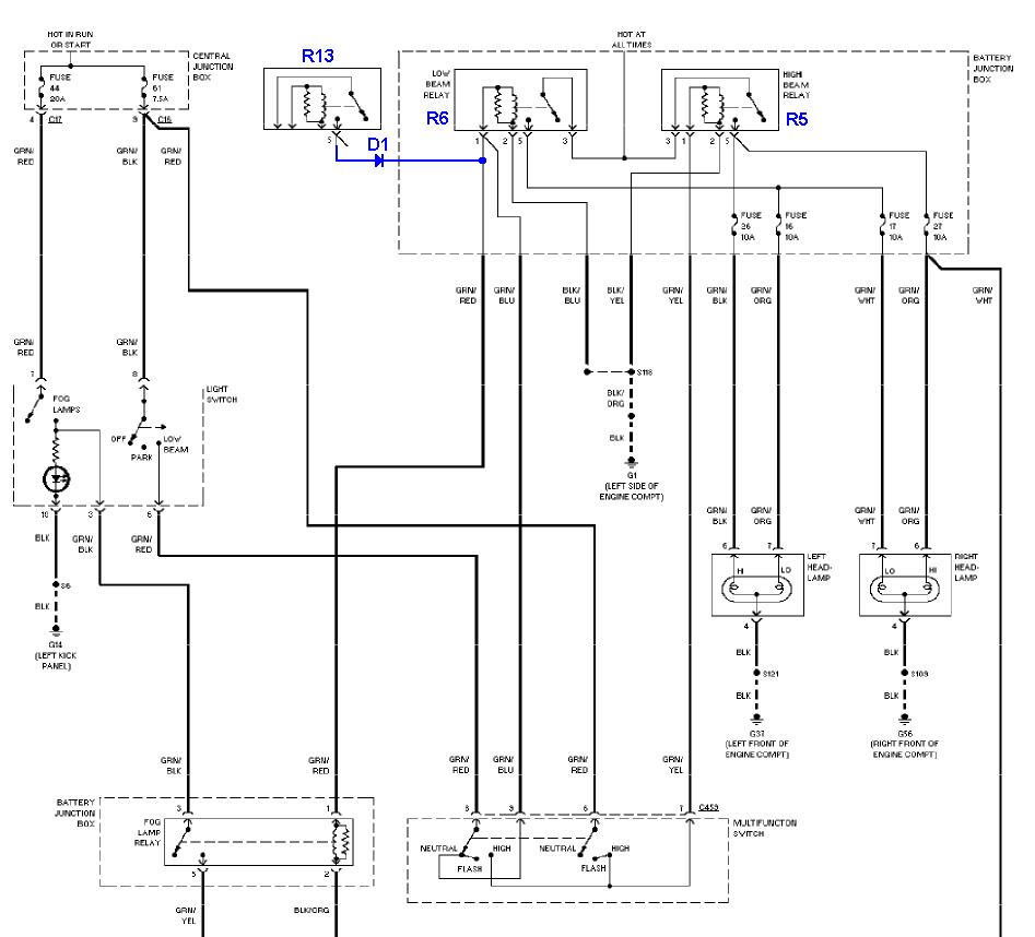 Jo a ještě k vlastní realizaci - já jsem to udělal tak, že jsem vytahal příslušná relé a doma jsem na ně připájel potřebné dráty (a diodu). Přitom jsem myslel na to, aby ty dráty moc nevadily v patici a relé tam šla zas nastrkat zpátky. Můžete to samozřejmě udělat i na straně pojistkové skříňky, ale nepřišel jsem na to, jak se jednoduše dostat k drátům, tj. vytahat ty patice pro relé.