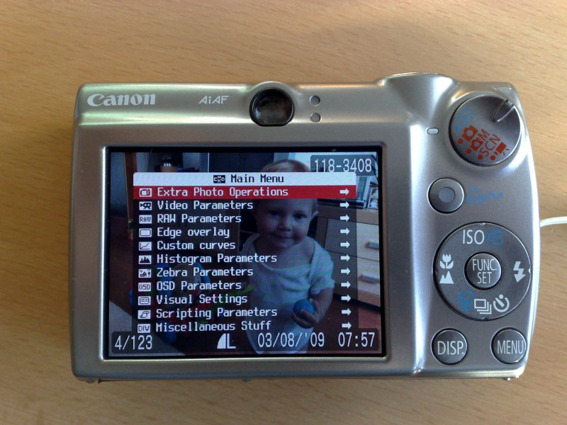 vcera som nasiel na nete fajn vecicku pre hracickov :-) Alternativny firmware pre CANON fotaky. Vlastne to ani firmware neni, lebo povodny sw zostava vo fotaku, ale je to aplikacia nahrata na pamatovu kartu, ktora dokaze divy s fotakom. Odfotil som normalne menu a menu po prepnuti do aplikacie. Zatial som sa s tym hral len velmi malo, ale rozhodne to stoji za vyskusanie! Princip je, ze na SD kartu skopirujete zopar suborov a po zapnuti fotaku si mozete zvolit, ci chcete pouzit normalny rezim, alebo tento. Da sa urobit aj to, aby to rovno startovalo do aplikacie.