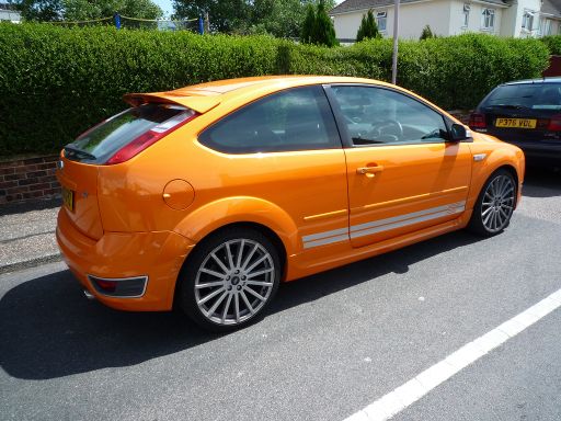 Ford Focus II 2.5T ST, 3 dv.,Electric Orange byl, je Golf GTI VII Performance Pack
