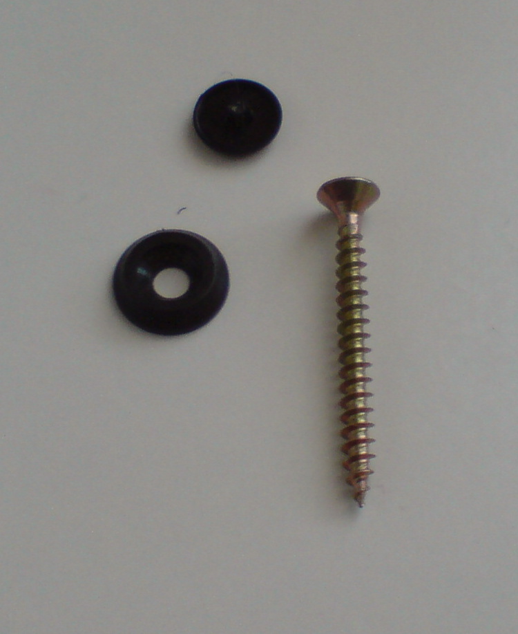 , šroubek je jen uprostřed ), jsem uprostřed těchto koleček provrtal 4mm vrtákem dírky. V těch místech se pak torpédo přišroubuje čtyřmi samořezkami 4x40 o původních plastových hmoždinek. Drží to výborně! Já jsem ale ještě řešil jak ty šrouby zamaskovat. Řešením by byly nějaké pěkné černé samořezky např. s torx hlavou, ty jsem ale nesehnal. Proto jsem v obchodě pro stolaře koupil čtyři černé plastové podložky pod vruty a čtyři nábytkové černé krytky na vruty viz foto: