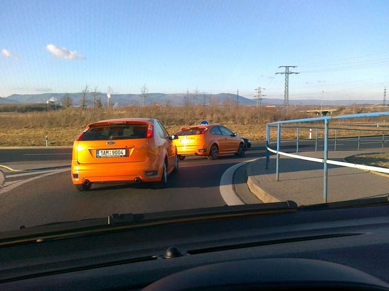 Ford Focus II 2.5T ST, 3 dv.,Electric Orange byl, je Golf GTI VII Performance Pack