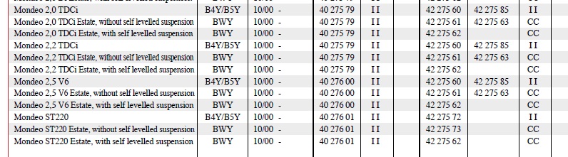 Skutečně, zakoupená pružina je typu CC a podle katalogu Lesjofors má být na všech Mondeích sedan vzadu typ II a na všech Turnierech CC.