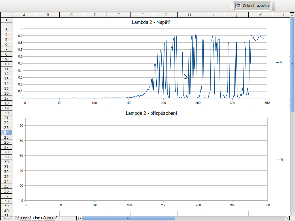 Dále jsem naměřil hodnoty z lambda sond a vypadá to, že jsou asi funkční. Jen mě zaráží, že od druhé lambdy je po celou dobu hodnota krátkodobého přizpůsobení 99,6%. Není to divné - jak to ukazuje vám? Doufám že mě nečeká výměna katalyzátoru