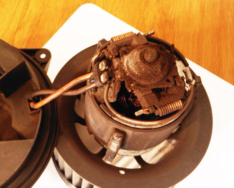Ventilátor rozebereš snadno,elektromotor je v tom plastovém krytu pouze nasuntej přes gumové vložky.Ani vrtuli nemusíš sundavat.Stačí prostříknout ložiska nějakým olejem ve spreji a chvíli s ním točit,aby se vyplavila rez.Já měl zatuhlé hlavně to spodní ložisko.Je vhodné neznečistit komutátor olejem,snížil by se výkon motoru,kvůli přechodovým odporům.