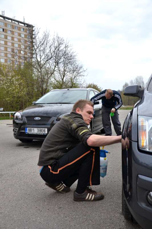 Sraz byl u Bauhausu, kde jsme doladili pár posledních chybějících maličkostí jako krycí pásky, rozstřikovač apod. Následoval přejezd do mycích boxů v KrPoli. Po domluvě najíždíme do boxů a já si spolu z mohutným zvukem škrábu spodní lem nárazníku o místní (z)propadenou vozovku (z auta důlek nebyl vidět). Nevadí, je to spodek a není to vidět