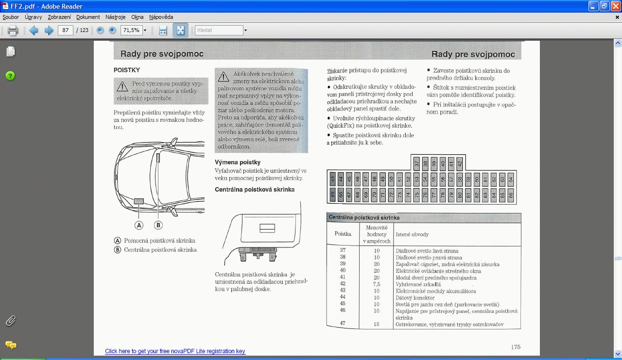 Četl jsem to tu ve fóru, odklopil jsem pojistky, nicméně na pozici 80 žádnou nemám. Přijde mi to divný... Auto sice bylo v servisu, ale že by vyndali pojistku... Navíc v manuálu (zde ve fórech) na FF II vypadá schéma (rozložení) pojistek jinak, než mám já - u mě jsou dvě dlouhé řady a nad nimi jedna kratší...