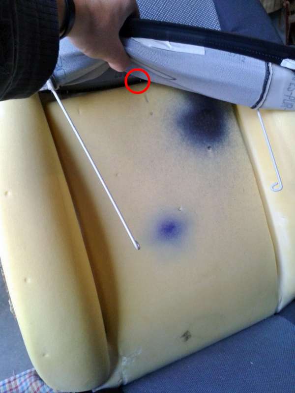 12) Vytáhneme potah zad až do úrovně kde se záda dělí (je zde háček kterým je potah přidělaný k sedadlu (červené kolečko). Tento háček necvakáme ale přiděláme k němu pomocí stahovací pásky topnou dečku zad.
