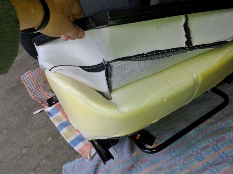 1) Vyndáme sedadlo z auta a uděláme si dostatek prostoru (nedokážu si představit dělat vše bez vymontování sedadel z auta, předevsím sundavání plastů). 2) Na těchto místech jsou 3 úchyty, které drží plast (na druhé, snažší straně, jsou pouze 2). Kolečko pro sklon sedadla silou k sobě vysuneme. 3) Zde jsou vidět úchyty. Červěně jsou označeny místa kde drží potah sedadla. Ten se musí silou vycvaknout. Žlutě je označený držák potahu se kterým je největší problém (na každé straně 2). Jde opravdu špatně vycvaknout a nejspíš ho pří demontáži poškodíte (nikaj to ovšem nevadí výsledné práci, není nic poznat) 4) Vycvaknutí potahu zespodu sedadla (provádí se asi na 3 místech) 5) Sundavání potahu 6) Potah je přidělaný k sedadlu kovovými kroužky. Zde se nebojte použít štípačky a kroužky přecvaknout (jinak to opravdu nejde, pokud u toho nechcete strávit týden) 7) Přestřihat stačí jen jedna strana a střed (pod zbytek už potah zasuneme rukou)