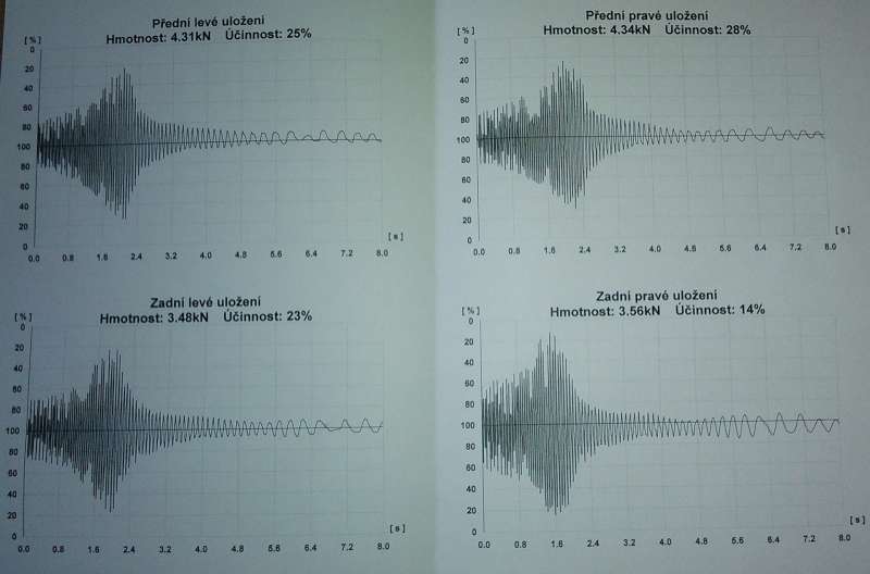 pisal som sem preto ze som bol na teste tlmicov pred nedavnom na STK , mali tam tie testovacie platne od vyrobcu MAHA , ujko to otestoval a vytlacil mi papier z testu , predna aj zadna naprava su v priemere na 61% opotrebovania a to mam uz najazdenych nieco cez 300 000km , co by nebolo az take hrozne ako ked vytiahol taku knizku od vyrobcu tych platniii teda opet MAHA a nakukol do nej a povedal ze minimum opotrebovania pre moje auto teda kombik mk3 GHIA je 59% , a pritom auto jazdi ok ziadny buchot nic , ale uz citit ze sa auto hupe a neni to ono , lebo akonahle presadnem do neakeho ineho auta hned viem ze to moje caka na vymenu tlmicov .