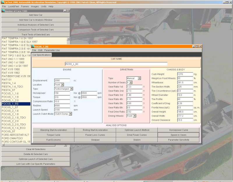 Ja som to tahal z torrentov (nazov je "Cartest 2000"). Len teda vsetky udaje k vytvoreniu noveho auta si musis zistit sam. Je to starsi problem a su tam len vybrane auta povedzme do roku 2001. Je potrebne vediet prevodove pomery, rozmery auta, charakteristiku motora. V pripade ze chces aby ti program ratal dynamicke parametre vozidla (zrychlenie, max rychlost, pruznost) tak aj krivku vykonu a koeficient odporu vzduchu, rozlozenie hmotnosti. Program ti vie zistit optimalne otacky a sposob pustenia spojky vzhladom na najlepsiu akceleraciu 0-100 a podobne dalsie somarinky, je toho vela. Pre zdatnejsich je moznost editovania specifickych parametrov, ktore tieto merania mozu ovplyvnit, teplota a vlhkost vzduchu, stupanie vozovky, tlak vzduchu v pneumatikach, protivietor, atmosfericky tlak vzduchu, cas potrebny na preradenie, valivy odpor, nabeh tlaku turba, straty diferencialov, prevodoviek, hmotnost vodica, hmotnost paliva a mnoho dalsich. Ale najvacsi problem z celeho su samozrejme prevodove pomery, bez ktorych tam auto ani nevytvoris.Váňa píše:maslo: Moc pěkný, dá se někde ten prográmek stáhnout