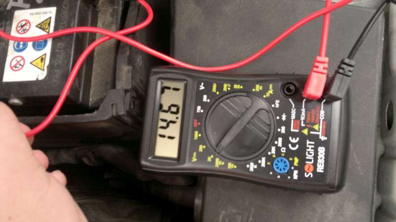 Este skus s tak pripojenym voltmetrom zapnut nieco, co poriadne zerie elektrinu. Napriklad vyhrievanie celneho skla. Zadne ma ovela menej. Alebo zapni naraz stretavacie+dialkove svetla a zadne okno. Svetla tak, ze zapnes stretavacie, cvaknes dialkove, vypnes stretavacie a pri najblizsom zapnuti stretavacich by mali (aspon na starych tak bolo) hned svietit aj dialkove. Ide o zmeranie, co urobi narazovy velky prudovy odber so stabilitou napatia.