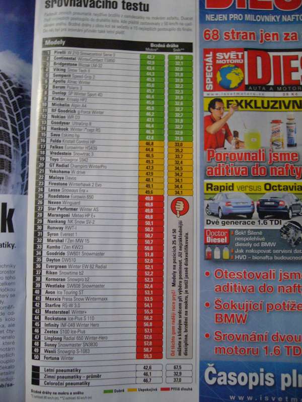 Tak na sněhu pokud nebydlíš na horách toho snad moc nenajezdíš.Jinak sem dávám fotky letošního testu auto bildu rozměru 195/85 R15.Na začátku hned vyřazujou ty co mají nejdelší brzdnou dráhu na mokru a do finále postupuje jenom 15 nejlepších.Rozdíl mezi nejhorší a nejlepší je 17 m !!!