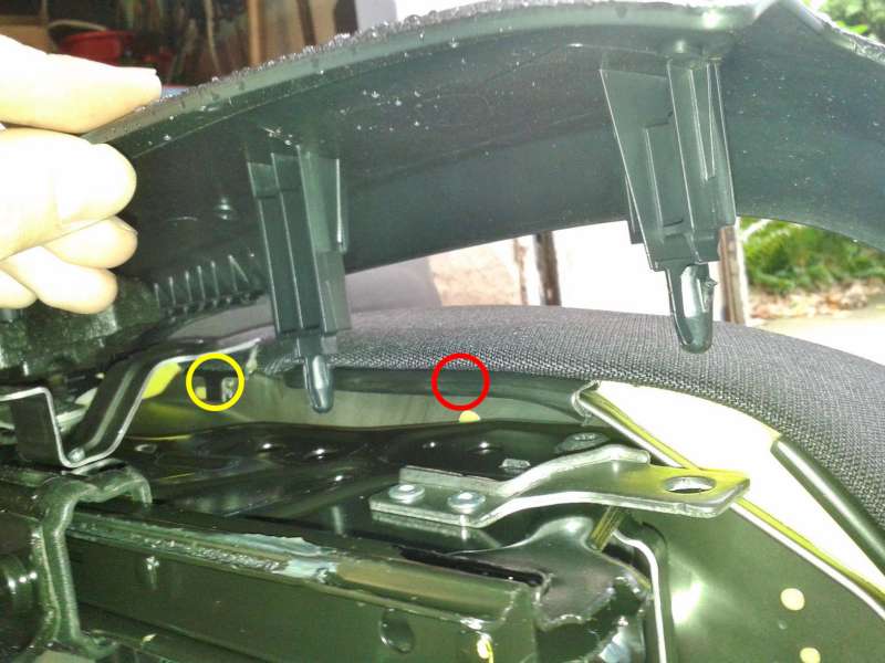 3) Zde jsou vidět úchyty. Červěně jsou označeny místa kde drží potah sedadla. Ten se musí silou vycvaknout. Žlutě je označený držák potahu se kterým je největší problém (na každé straně 2). Jde opravdu špatně vycvaknout a nejspíš ho pří demontáži poškodíte (nikaj to ovšem nevadí výsledné práci, není nic poznat)