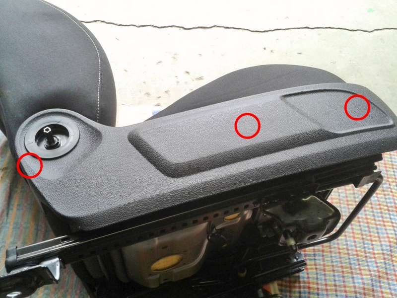 1) Vyndáme sedadlo z auta a uděláme si dostatek prostoru (nedokážu si představit dělat vše bez vymontování sedadel z auta, předevsím sundavání plastů). 2) Na těchto místech jsou 3 úchyty, které drží plast (na druhé, snažší straně, jsou pouze 2). Kolečko pro sklon sedadla silou k sobě vysuneme. 3) Zde jsou vidět úchyty. Červěně jsou označeny místa kde drží potah sedadla. Ten se musí silou vycvaknout. Žlutě je označený držák potahu se kterým je největší problém (na každé straně 2). Jde opravdu špatně vycvaknout a nejspíš ho pří demontáži poškodíte (nikaj to ovšem nevadí výsledné práci, není nic poznat) 4) Vycvaknutí potahu zespodu sedadla (provádí se asi na 3 místech) 5) Sundavání potahu 6) Potah je přidělaný k sedadlu kovovými kroužky. Zde se nebojte použít štípačky a kroužky přecvaknout (jinak to opravdu nejde, pokud u toho nechcete strávit týden) 7) Přestřihat stačí jen jedna strana a střed (pod zbytek už potah zasuneme rukou)
