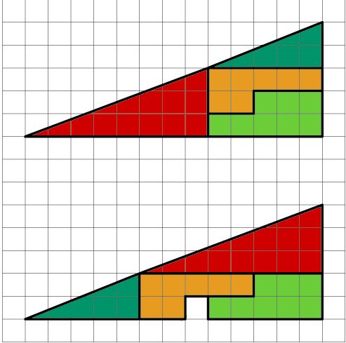 Oba dva tojúhleníky mají stjene dlouhé odvěsny, ale stačí přeskupit obrazce, a najednou je jeden čtvereček navíc. Jak je to možné?