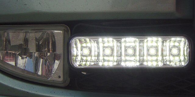 Tak, nafoceno (ale žádná sláva, mám takový historický foťák). Svítí to opravdu skvěle, jen je potřeba je natočit malinko nahoru, aby byly dobře vidět i z nákladních vozidel. Automatika je rozsvěcí nikoliv při zapnutí zapalování, ale až při startu vozidla, zhasnutí je několik vteřin po vypnutí motoru. Neničí se tak drahé žárovky v hlavních světlometech a displej rádia svítí pořádně a ne napůl
