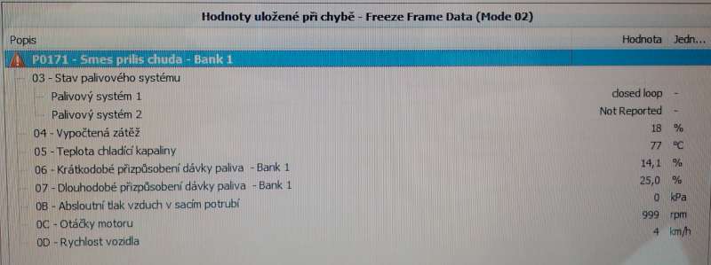 Já už se z toho asi picnu. Hned po koupi jsem zjistil, že při dojezdu na křižovatku na volnoběh mi auto dost vibruje, to samé když stojim. Pokud ještě k tomu pustim třeba klimu, tak otáčky začnou kolísat až pod 600, světla poblikávaj a i je slyšet kolísání ventilátoru při poklesu otáček. Sice mi motor ještě nechcípnul, ale ty vibrace jsou dost nepříjemný. Už jsem vyměnil svíčky, volnoběžný ventil, hadičky emisního systému, vyčistil škrtící klapku a pořád žádná změna. Nevím jetli s tím taky nesouvisí uložená závada, která se objeví jednou za čas P0171 - směs příliš chudá, výpis Freeze frame viz příloha. Nějak se mi tam nezdá hodnota absolutního tlaku na sání a dlouhodobé přizpůsobení dávky paliva. Že by snímač talku na sání. Může to mít vliv na kolísání volnoběhu?