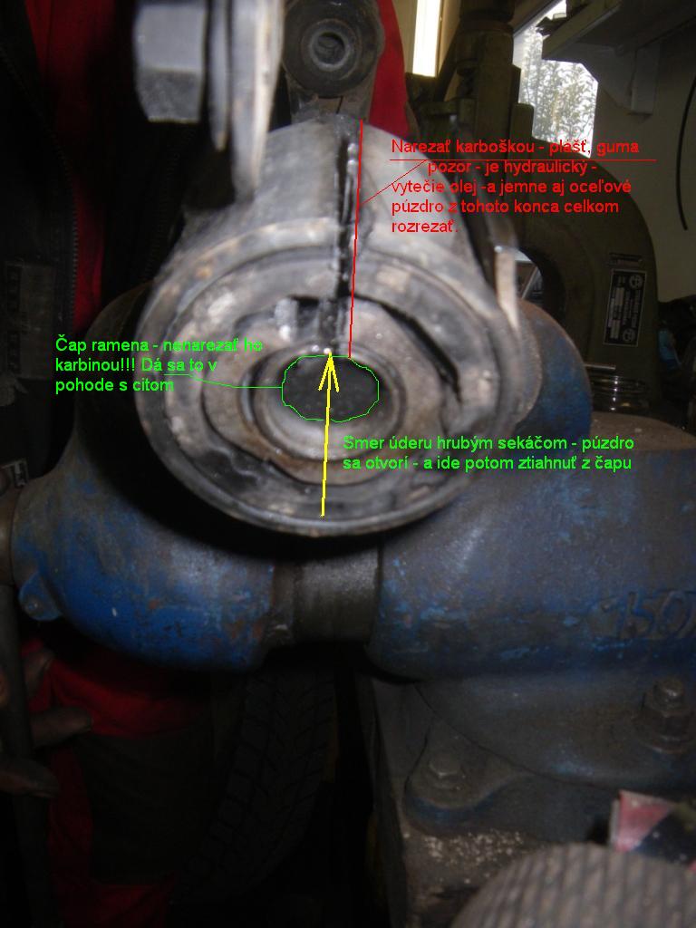 Keďže som čítal o tom ako šli ťažko dolu tuším Dav-ovi, tak sme skúsili s majzlom, ale keď nešiel dolu z čapu - po troch ranách prišla k slovu flexa - prerezať plechový plášť, potom gumenú výplň a potom opatrne narezať plechové púzdro a na konci - kam až čap ramena nedosiahne ho rozrezať celkom.